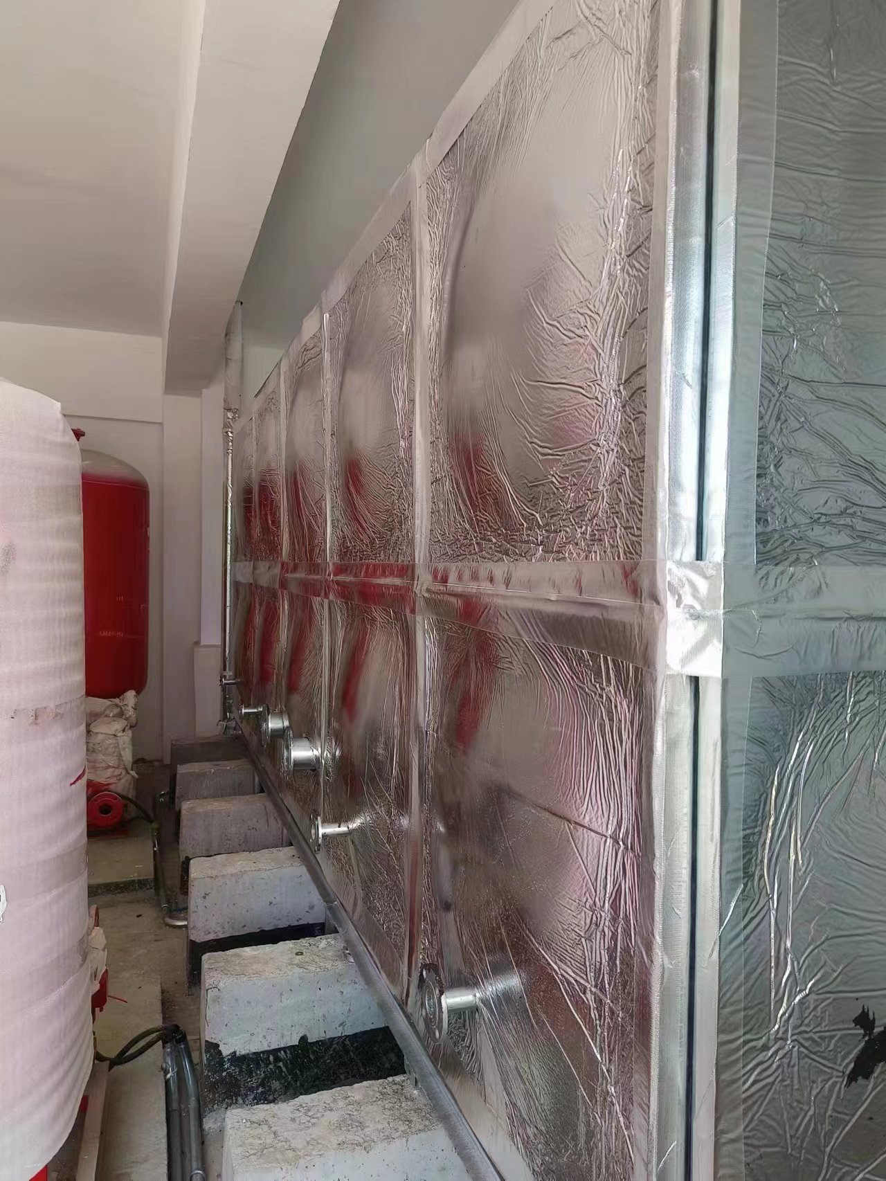 鍍鋅橡塑鋁箔布保溫水箱現場圖:客戶根據自己實際要求設置的條形基礎,安裝工人到達現場就可以直接焊接槽鋼底座,不耽誤工期。騰翔公司具有專業的安裝團隊,保障了安裝水箱的質量和效率。鍍鋅橡塑鋁箔布保溫水箱是適合用在室內的保溫水箱,保溫效果好,價格適中。
